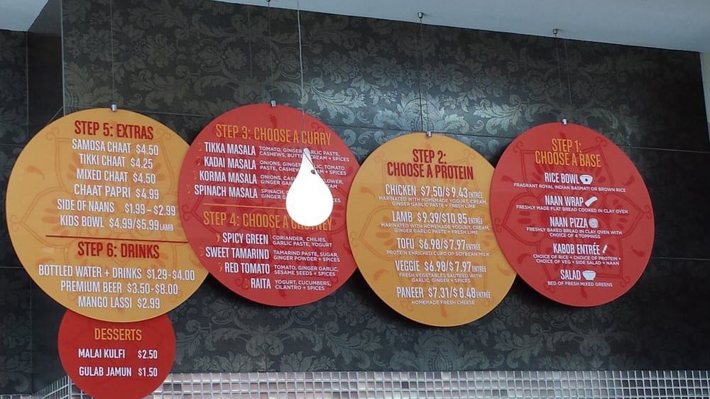 Choose your naan, rice, protein, curry, toppings, chutnies and extra proteins